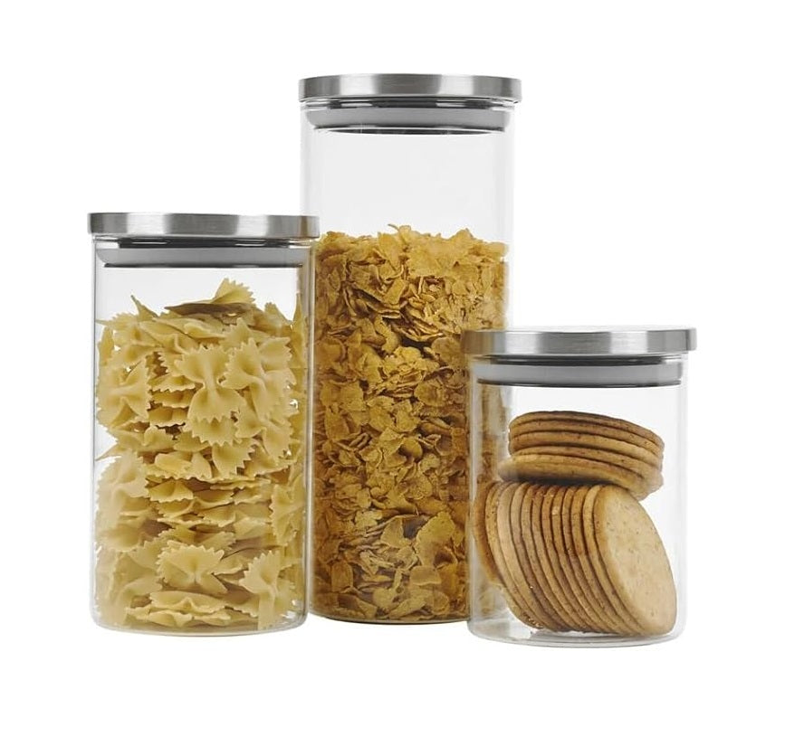 Mantieni freschi pasta, cereali, biscotti e ingredienti secchi con il nostro set di 3 barattoli in vetro con coperchi ermetici in metallo. Qualità, praticità ed eleganza per la tua cucina.