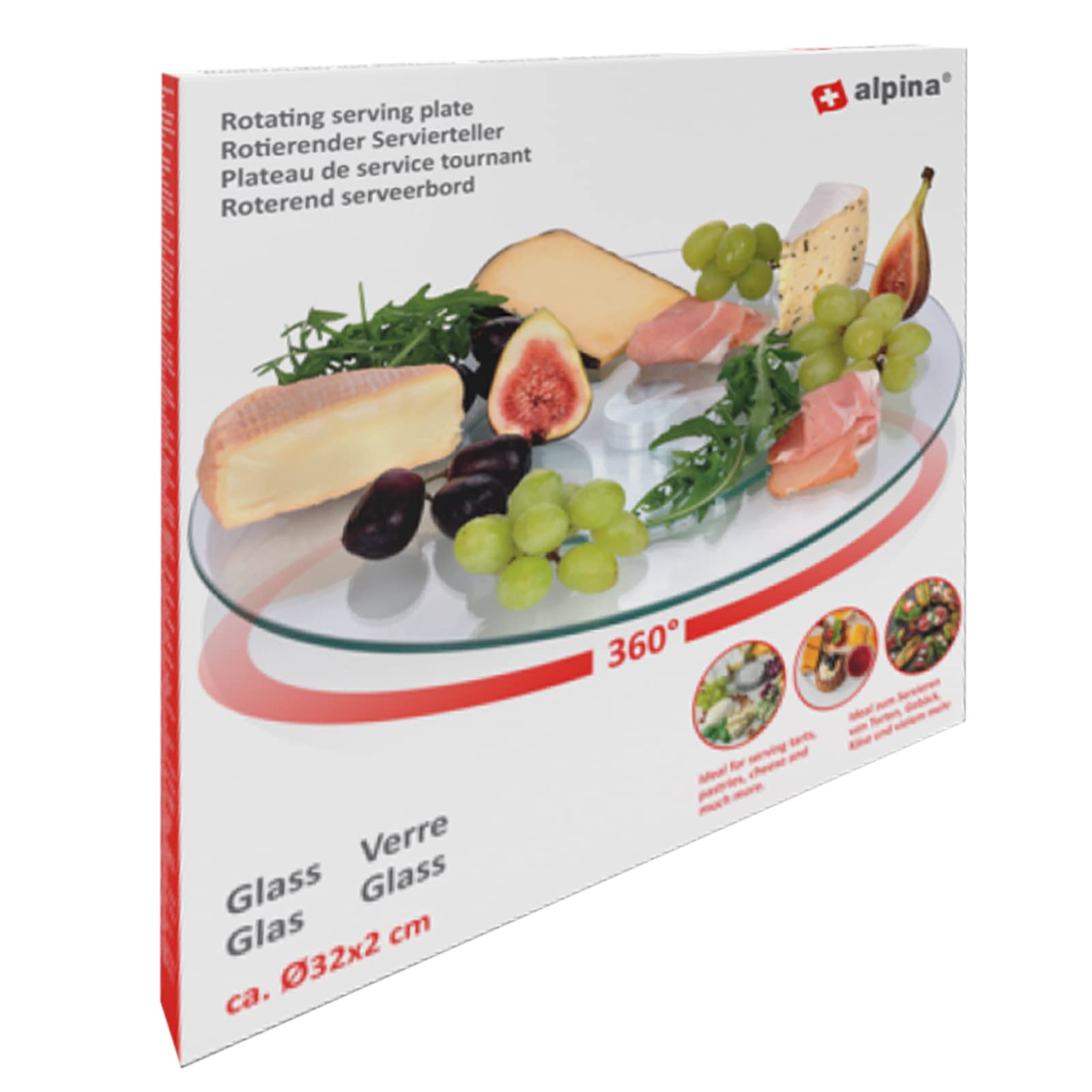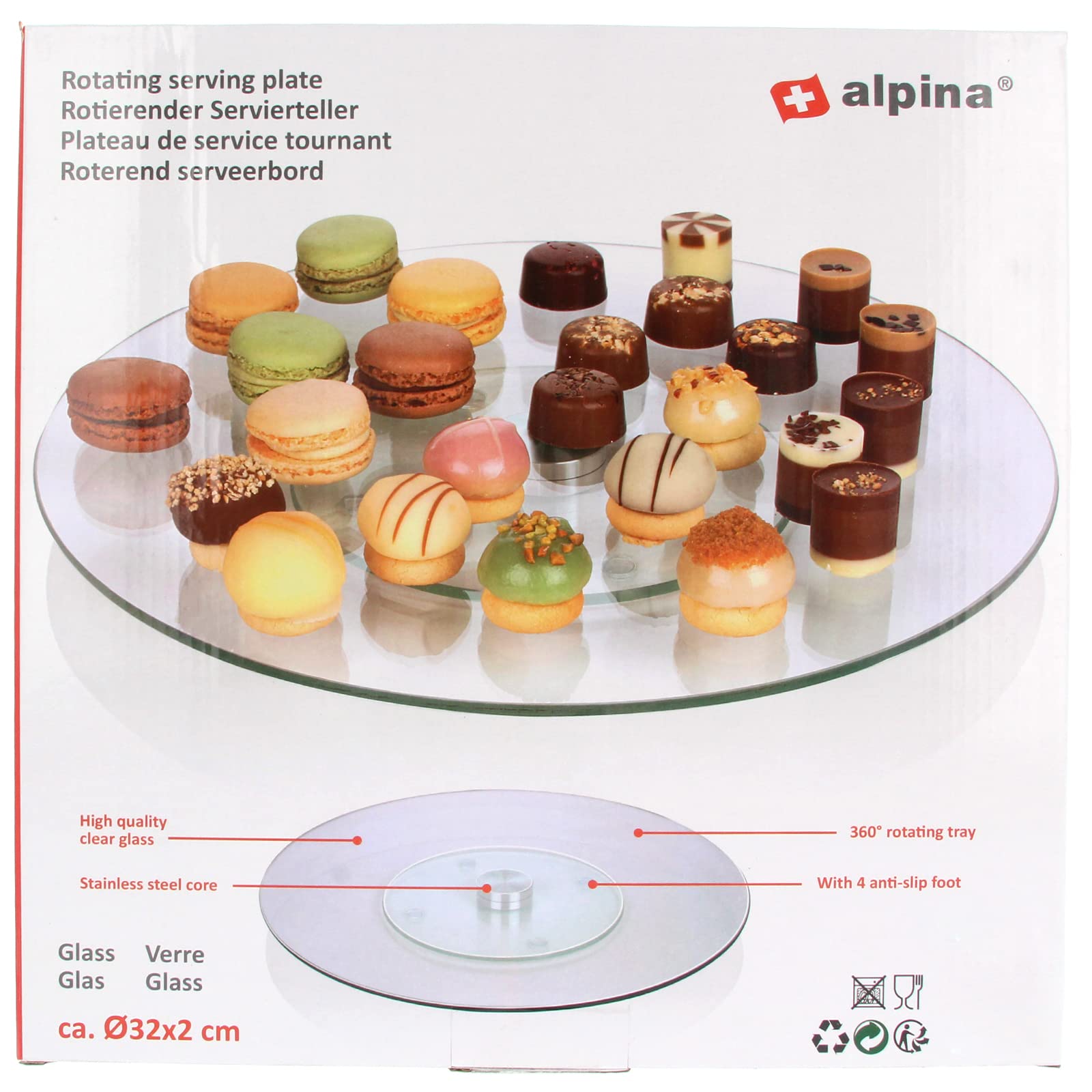 - Le dimensioni di questo giradischi in vetro rotante Alpina sono: diametro 32 cm e altezza 2 cm.