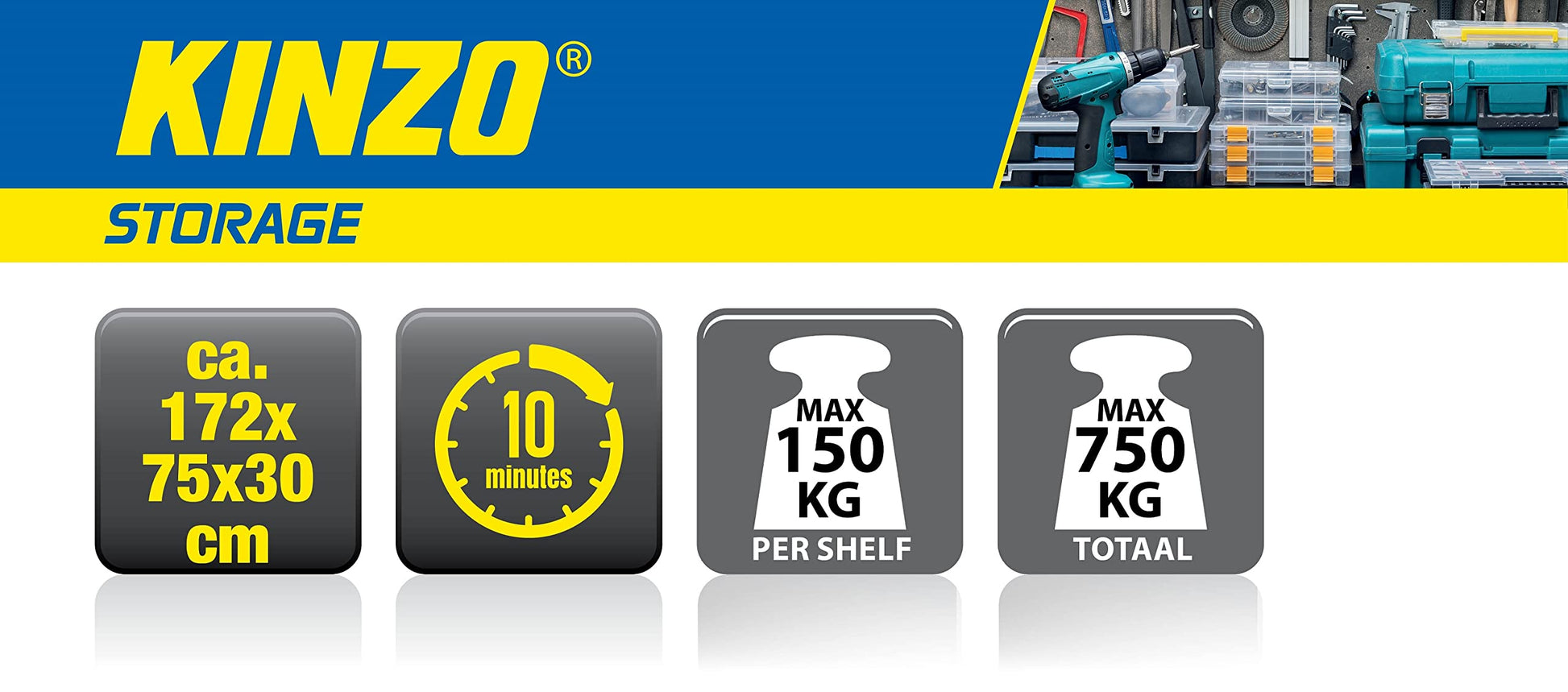 Kinzo è sinonimo di qualità e robustezza per soluzioni professionali di stoccaggio. Questo scaffale heavy duty è progettato per durare anni anche con carichi pesanti quotidiani.