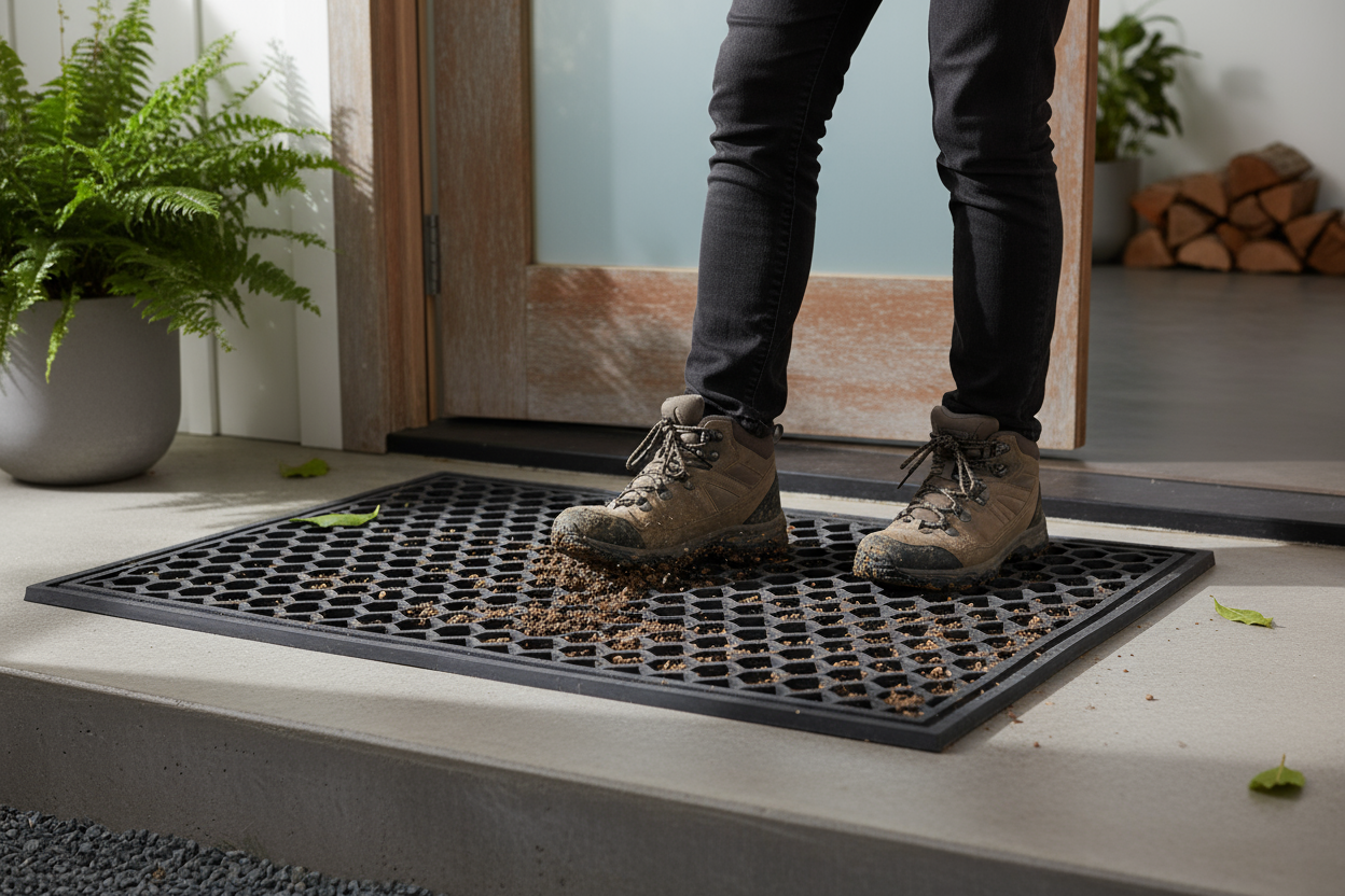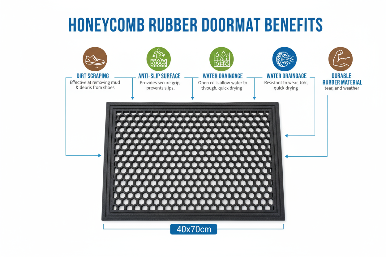 Mantieni puliti i tuoi ambienti con questo zerbino professionale in gomma naturale, progettato con una trama a nido d'ape che cattura efficacemente lo sporco dalle calzature.
