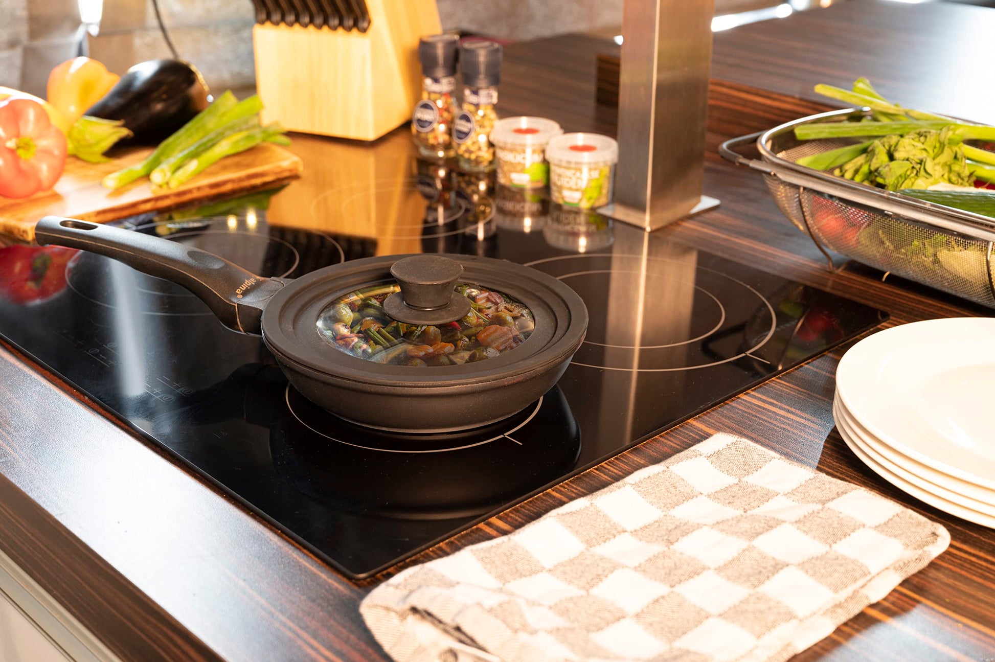- COPERCHIO PADELLA - Grazie al bordo in silicone del coperchio, il calore viene trattenuto in modo ottimale, riducendo i tempi di cottura, risparmiando energia e mantenendo la cucina più pulita.